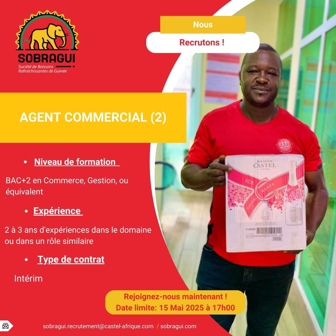 Dans le cadre de la mise en œuvre de son organigramme cible, la SOBRAGUI S.A. est à la recherche de candidats dynamiques pour le poste d’Agent Commercial .