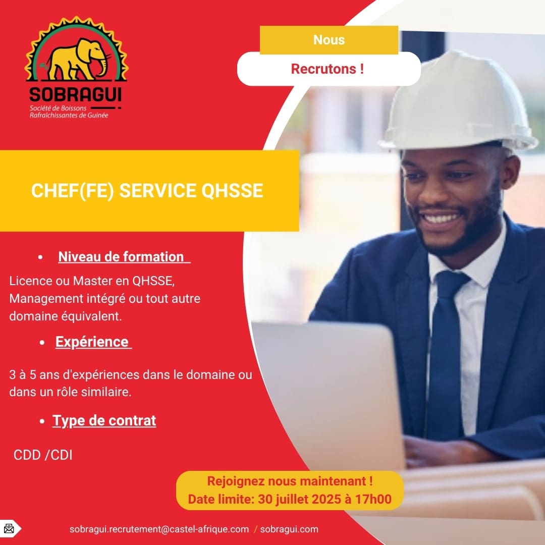 Dans le cadre de la mise en œuvre de son organigramme cible, la SOBRAGUI S.A. est à la recherche de candidats dynamiques pour le poste de Chef(fe) de Service Qualité, Hygiène, Santé-Sécurité, Environnement et sureté