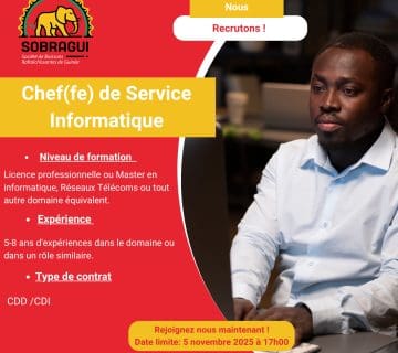 Dans le cadre de la mise en œuvre de son organigramme cible, la SOBRAGUI S.A est à la recherche de candidates organisées, motivées et dynamiques pour le poste d’Assistante de Direction.