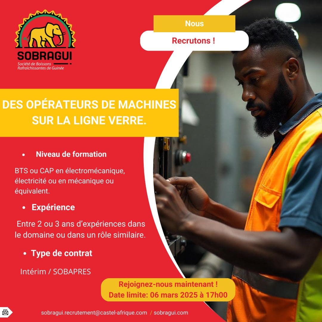 Dans le cadre de la mise en œuvre de son organigramme cible, la SOBRAGUI S.A. est à la recherche des candidats dynamiques pour le poste d’opérateurs de machines sur la ligne verre
