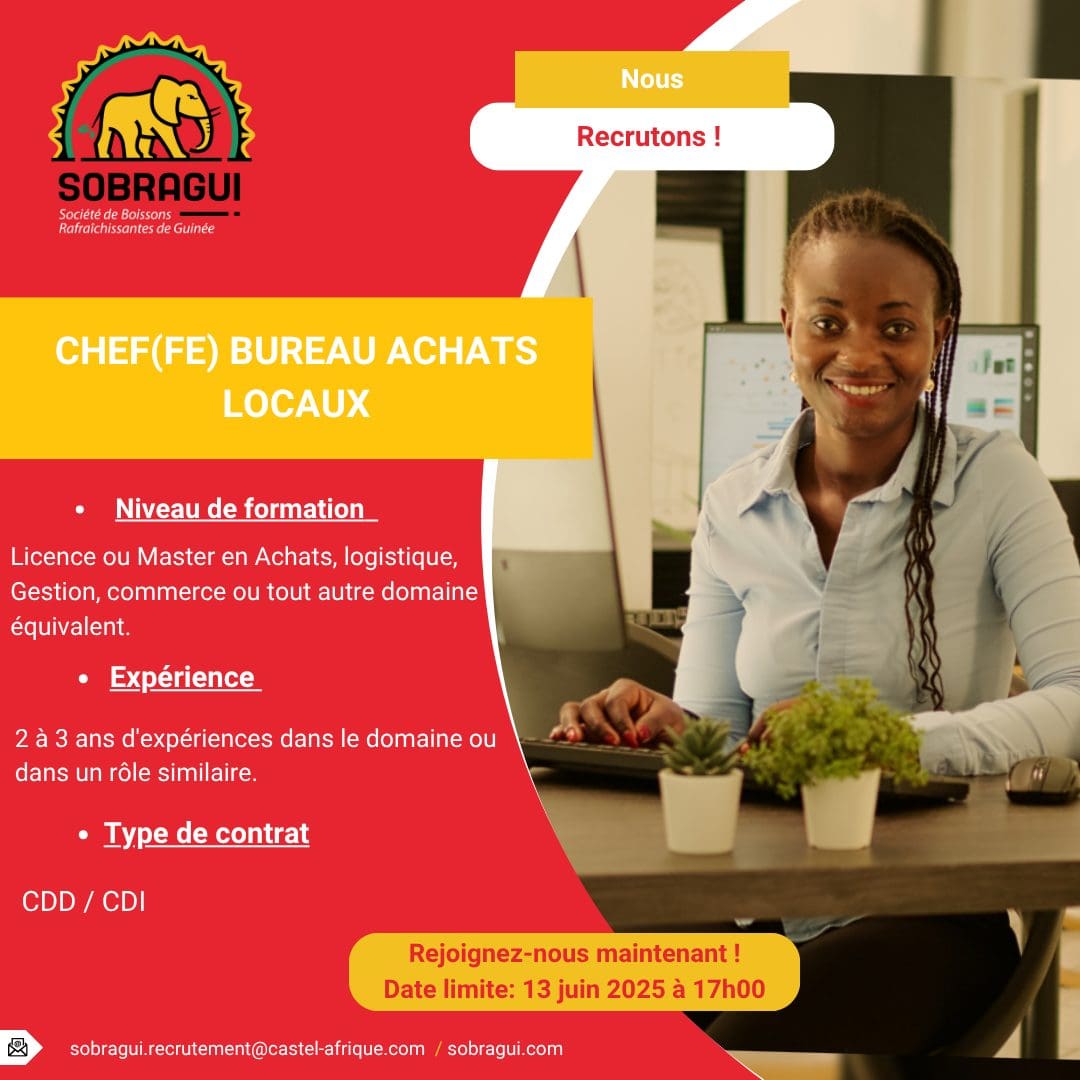 Dans le cadre de la mise en œuvre de son organigramme cible, la SOBRAGUI S.A. est à la recherche de candidats dynamiques