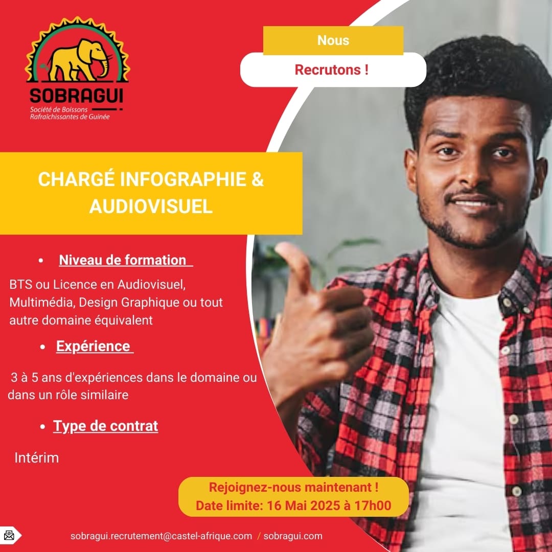Dans le cadre de la mise en œuvre de son organigramme cible, la SOBRAGUI S.A. est à la recherche de candidats dynamiques pour le poste de « Chargé Infographie / Audiovisuel « .